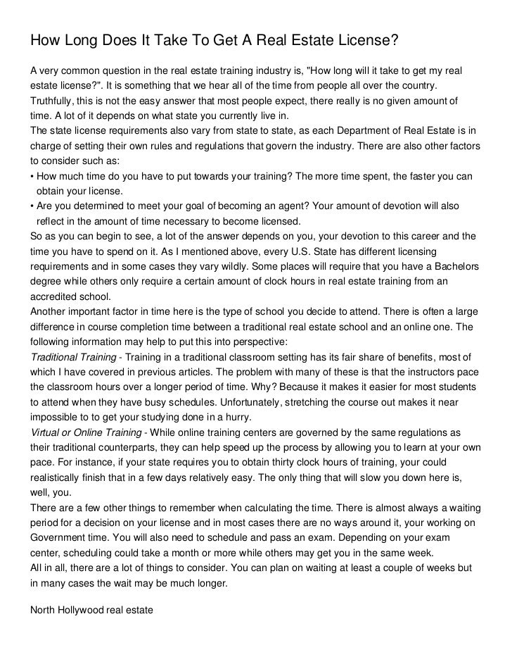 Question: How Long Does It Take To Become A Licensed Real ... from californiainform.com Check spelling or type a new query. What does it take to get a real estate license. Maybe you would like to learn more about one of these? We did not find results for:
